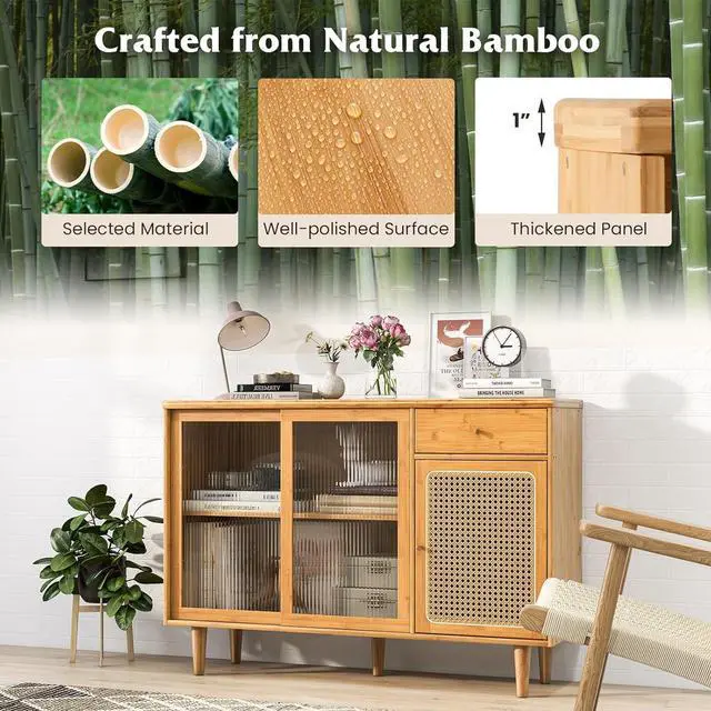 Natural Bamboo: Durability meets style with the sturdy bamboo buffet cabinet, ensuring that it will be a long-lasting and beautiful addition to your home. The well-polished surface allows for easy maintenance, while the 1" thickened panel ensure maximum durability.