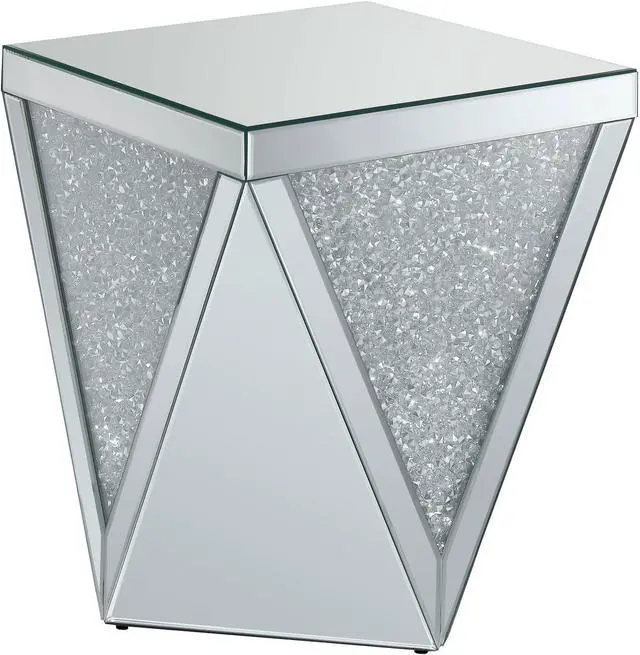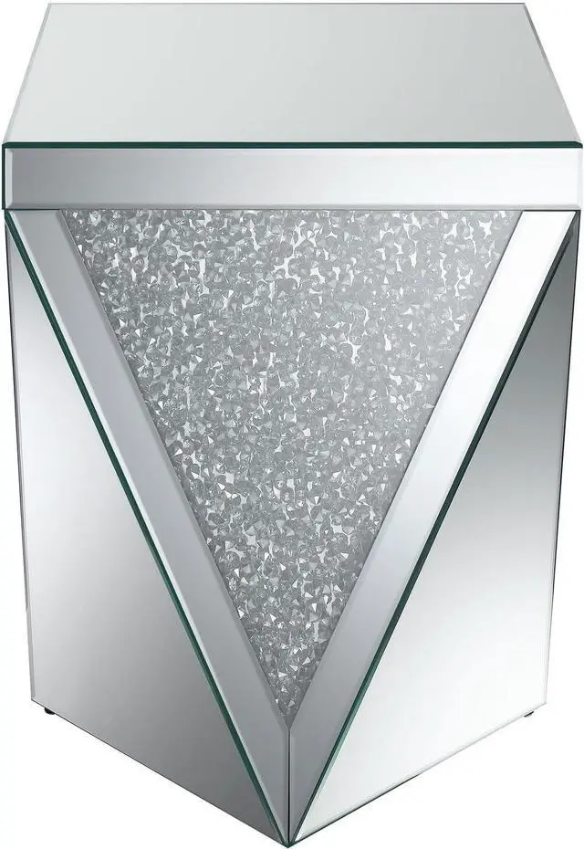 Set includes: One (1) end table Finish: Silver and clear mirror Product materials: Mirror and MDF Overall end table: 23.25 " H x 18.75 " W x 18.75 " D Assembly Required: Yes