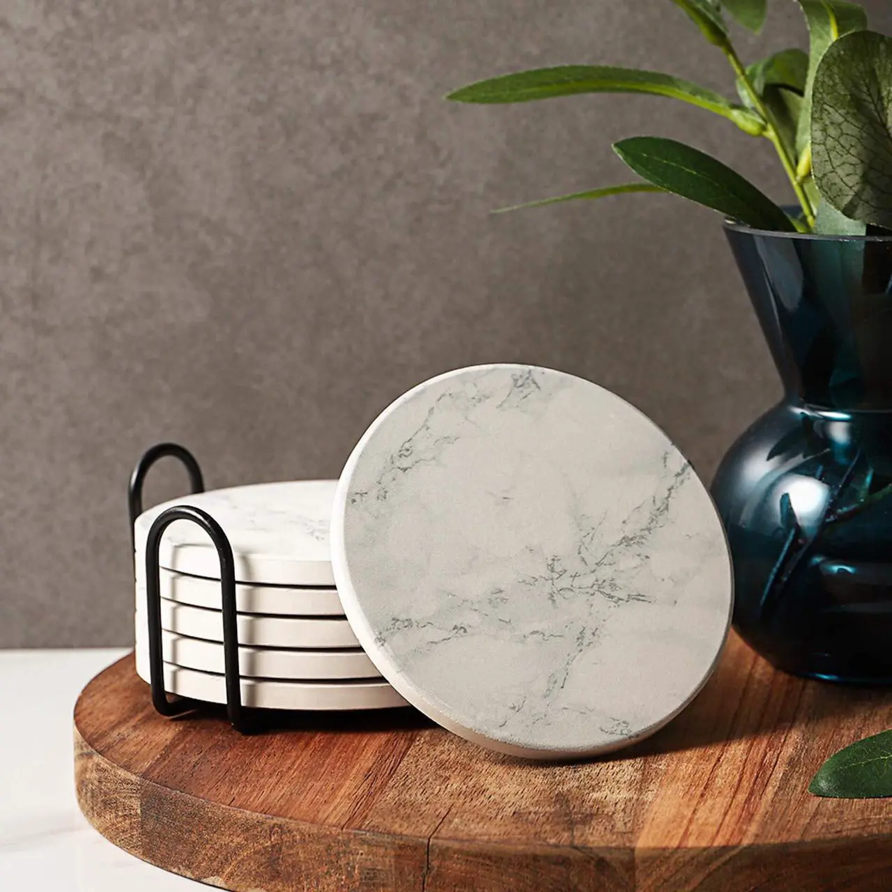 - Product information - you will get 6 white marble-style absorbent drink coasters and a metal black holder, these coasters are carefully packed in a box