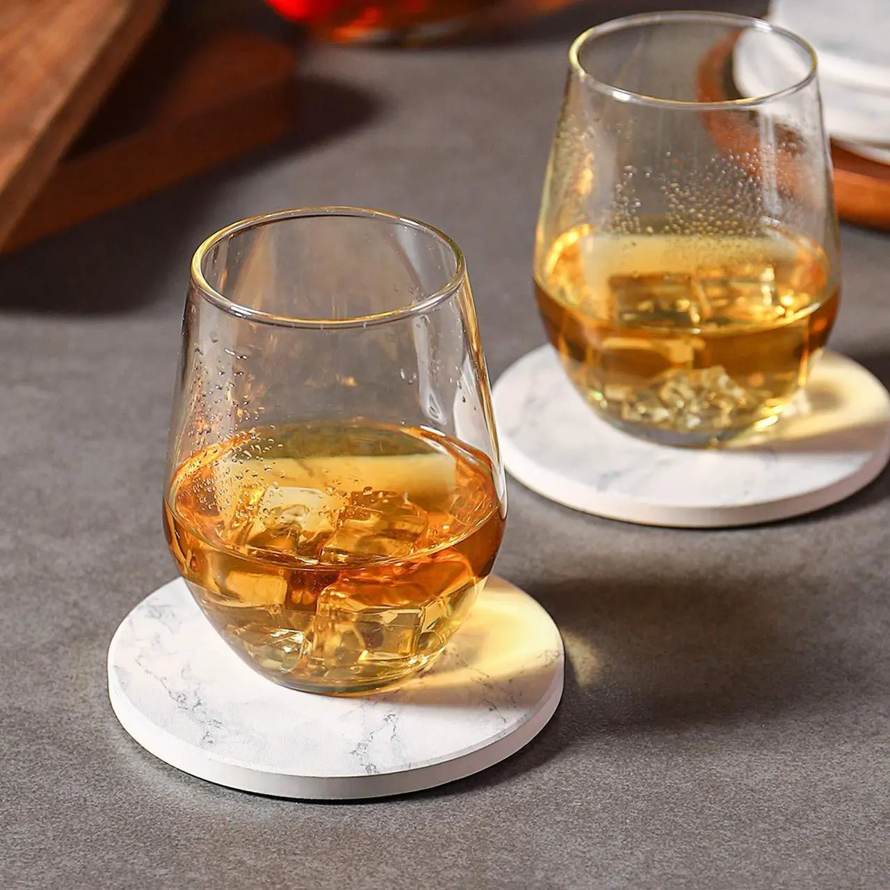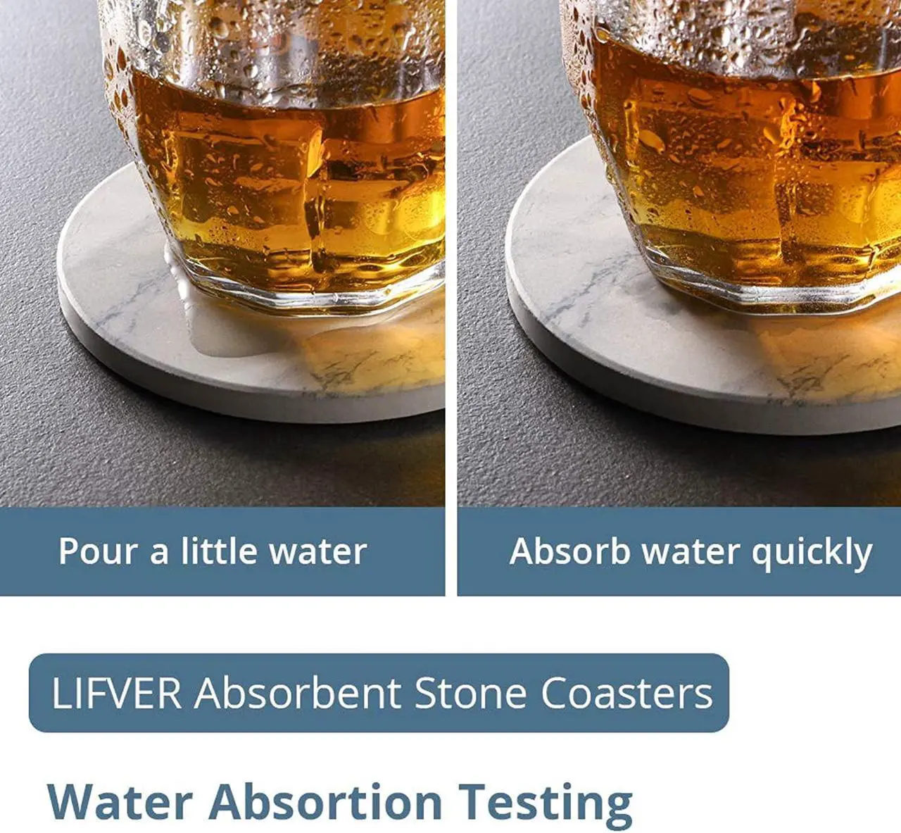 - KEEP desktop dry and clean - made from absorbent stone, the surface of the coasters absorbs coffee stains or water rings quickly within 5-10 seconds, will not stick to the glass or wooden table