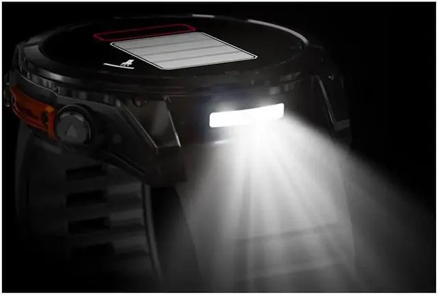 Stay connected with the built-in speaker and microphone, allowing you to make and receive calls directly from your wrist when paired with your smartphone. Utilize off-grid voice commands or your phone's voice assistant for seamless interaction. The integrated LED flashlight, with variable light intensities and a red safety light, enhances visibility in low-light conditions, while the strobe mode synchronizes with your running cadence.