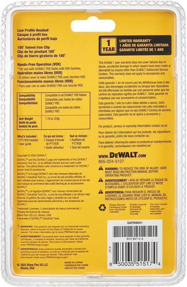 The DEWALT DXFRSSV1 Walkie Talkie Headset is compatible with DEWALT DXFRS300 and DXFRS800 Walkie Talkie 2-way radios. Stealth-Savvy headset with push-to-talk (PTT) and voice-operated switch (VOX) button. Covert air acoustic tube, 180 swivel clip. 63 in. cable length.