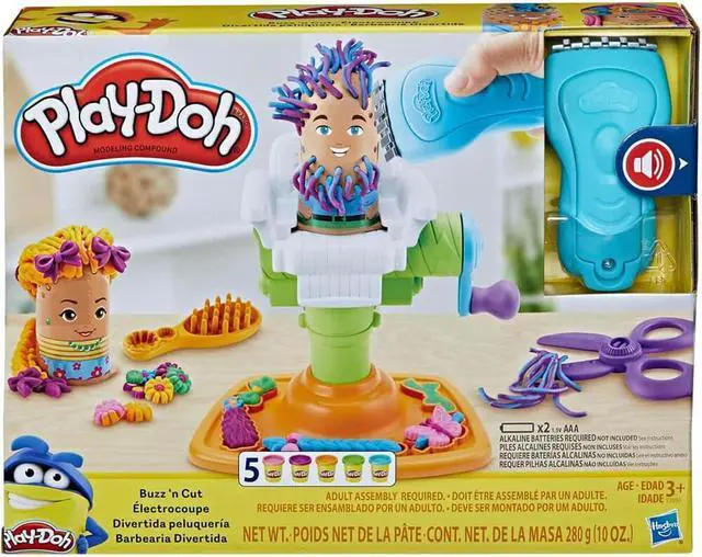Stop by the Buzz 'n Cut salon for a silly haircut and a shave. This Play-Doh barber shop set is based on the classic Play-Doh hair growing sets with a cool added surprise: an electric buzzer that makes real buzzing sounds when it touches Play-Doh compound! To start, just place one of the 2 characters in the chair and turn the crank to grow hilarious hair or a bristly beard. Give them a trim or shave it all off with the electric buzzer, plastic razor, and kid-friendly plastic scissors. Create a fresh and funky look by adding bows, braids, mustaches, and other accessories with the half-molds. Use the brush to remove leftover Play-Doh bits from the characters heads, then start all over with a new style. There are so many different hairstyles to make again and again! What will your silly stylist create? Hasbro, Play-Doh, and all related properties are trademarks of Hasbro.