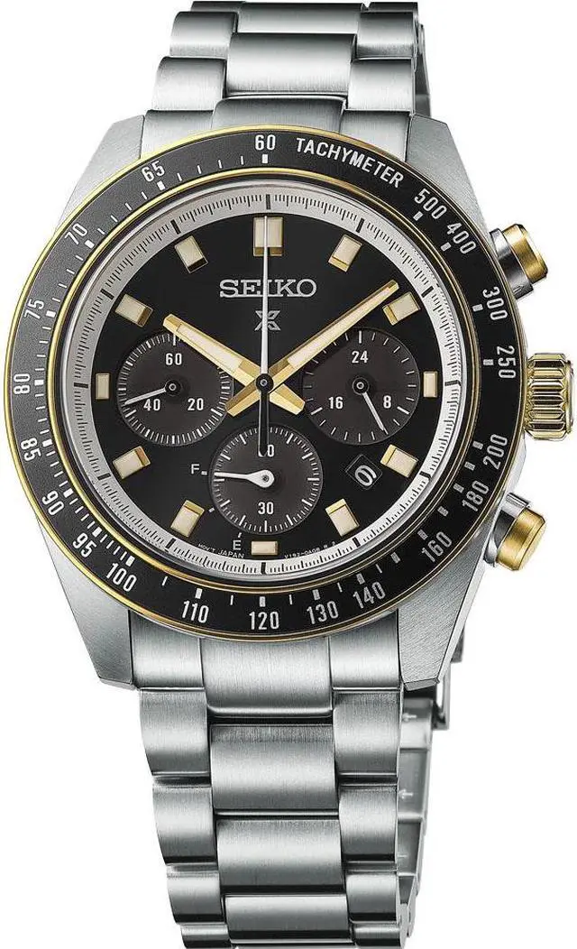 Prospex Speedtimer Solar Chronograph. Designed for those who treat life as the ultimate adventure, Seiko Prospex keeps moving forward, meeting every challenge with technological excellence and winning design. This rugged and stylish watch is a part of a high-intensity collection inspired by classic motorsports in the 1970s, when Seikos original 1969 Speedtimer, the worlds first self-winding chronograph, was at its prime. Reflecting the theme of a circuit race, the black and gold accents of the dial and tachymeter bezel evoke racing with extraordinary speed and excitement. The chronograph function measures up to 60 minutes of elapsed time in 1/5-second increments and includes a split time function, while the solar cell, powered by any light source with no battery change required, provides a 6-month power reserve when fully charged.