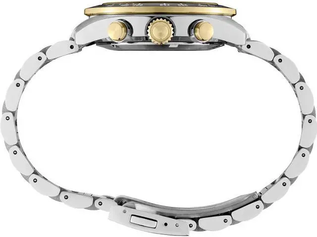 The black dial with gold accents features three black subdials with a 24-hour indicator and power reserve indicator, as well as a date calendar, and LumiBrite hands and markers. Crafted of stainless steel, this sporty model includes a curved anti-reflective sapphire crystal, secure screwdown caseback and tri-fold push button release clasp. 10 bar, 100M Water Resistant