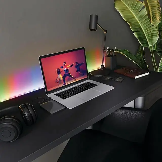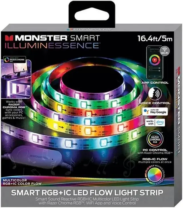 Backlight any area with the Monster Smart Sound Reactive RGBIC Flow Effect with Multi-Color Multi-White LED Light Strip. This 16.4 ft LED Light Strip is the perfect item for adding ambiance to your environment. Watch the flow as the LED Light Strip showcases multiple colors at once for a flow effect. Use the mobile application to create and customize the perfect aura for any occasion. It can be easily added to any space by using the built-in adhesives to mount the light strip on any flat, clean surface. Use the included wall adapter to create dynamic lighting for your HDTV or a computer! The Monster Smart Sound Reactive RGBIC Multi-Color Multi-White LED Light Strip technology is easy to install and sure to satisfy & bring a pop of color to any space!
