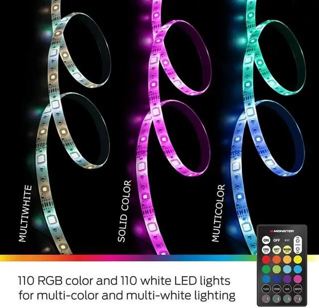 Want a better way to light difficult spaces or backlight your favorite devices for the optimal experience? With the Monster Multi-Color Sound Reactive LED Light Strip, those concerns will be a thing of the past. At 6.5 feet, it's a snug fit for your TVs, gaming consoles or other spaces. You can customize the color, lighting, and brightness settings to best reflect your own personal preferences. Using the included remote control, you can enhance those settings and make it the perfect combination for your changing space. The strip's built-in microphone also picks up on the beats of your music or games, reacting with striking color displays.