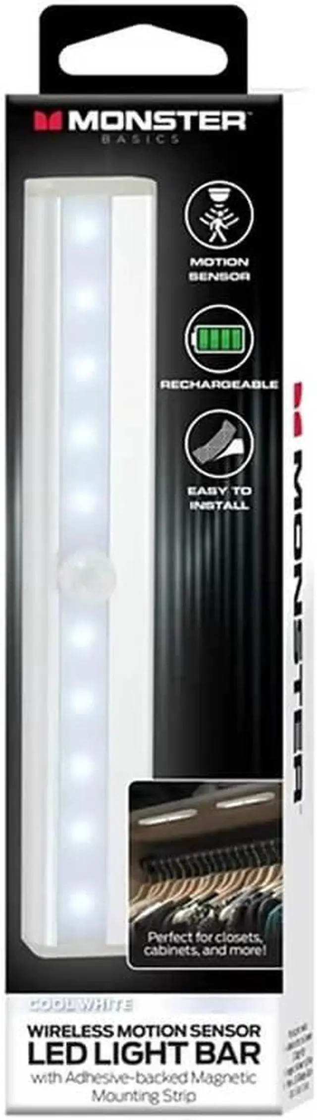 Want to add a little more color and light to your office area Turn to the Monster Rechargeable Motion Activated Bright White LED Light Bar. With the 10 bright white LED lights, you can light up the desk area for your space. Great for dark closets and under cabinets locations as well as your computer desk area. The item also features a motion sensor with detection timer to activate whenever you enter the space your lights are occupying. Installation's a breeze, just peel off the back covering on the magnetic mounting strip and place it in the desired location.