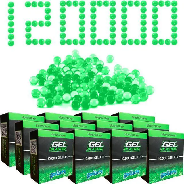 Gel Blaster Gellets are small, colorful, water based self absorbing balls or water beads. Gellets, when fully hydrated, reach the ideal size of 7.5 mm which is perfect for enjoying gameplay with Gel Blaster products. These eco-friendly, non-toxic, and non-irritating water beads are safe for everyone! Gel Blaster Gellets disintegrate on contact and the particles begin to dehydrate back into their original state, leaving no mess, no cleanup, and no worries! Included is 10, 000 Electric Green Gellets that can be used in the Surge or Starfire blasters for hours of play! No mess fun Gel Blaster Gellets are small, colorful, water based self absorbing balls made of starch and water.