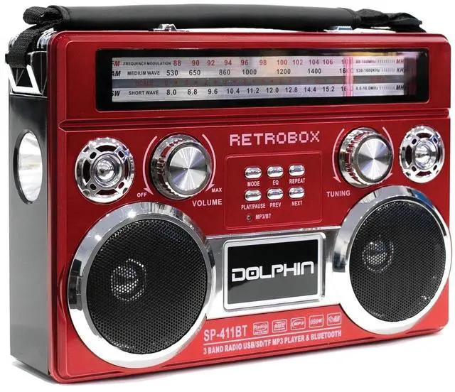 The Red Dolphin Audio RETROBOX Portable Mini Bluetooth Speaker is a modern take on a retro design! Along with the trusted and loved AM/FM/SW modes, this speaker also has Bluetooth, which will allow you to play music from any Bluetooth device.