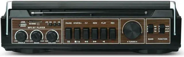 It also supports MP3 playback via a built-in USB input, allowing music to be played directly from a USB flash drive, and includes an SD card slot for playing music stored on SD cards. The integrated Bluetooth capability enables wireless connection to external Bluetooth-enabled devices, providing seamless streaming of music. A classic cassette player adds a touch of nostalgia, perfect for playing cherished tapes from the past.