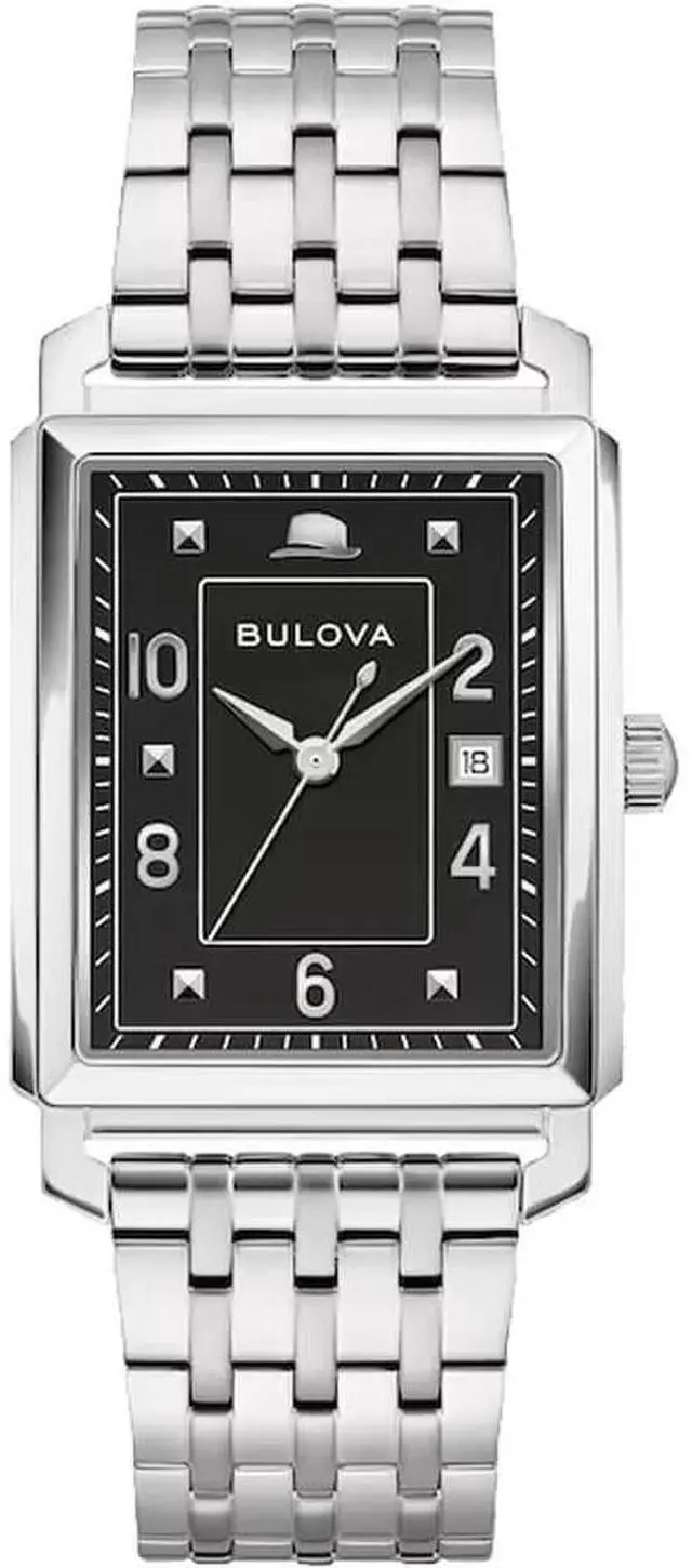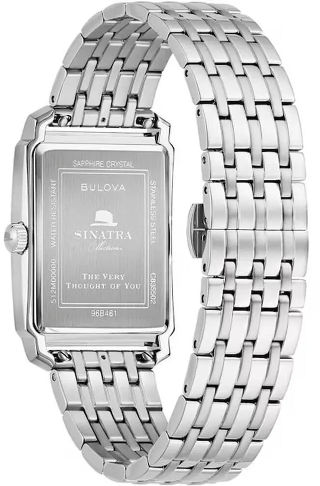This enduring design from Bulovas Frank Sinatra collection is inspired by classic Bulova model from the legendary crooners heyday. The watch features a 30mm silver-tone stainless steel case with a curved sapphire crystal with anti-reflective coating, a case back engraved with the Sinatra logo and The Very Thought of You, and a matching 7-row bracelet with a push-button deployment clasp. The radiant black dial is appointed with a date display and silver-tone hands and applied markers, including Sinatras signature fedora at 12 oclock. As classic as Sinatra himself, this Bulova mens watch offered in a custom Frank Sinatra box is a timeless addition with style that will last a lifetime.