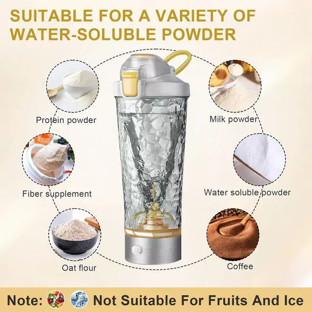 Suitable for a variety of beveragesThe Electric Protein Shaker Bottle suitable for a variety of water-soluble powders, such as protein powder, dietary fiber supplements, milkshake powder, oatmeal powder, instant coffee, etc.