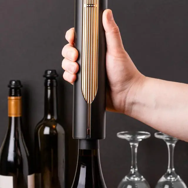 PREMIUM BUILD AND STYLE: Crafted from durable aluminum alloy, this electric wine bottle opener features a luxurious black and gold design that looks great in any kitchen, bar, or wine station. The ergonomic grip offers comfort and control, while the seamlessly integrated foil cutter ensures clean wine bottle prep every time. A stylish and functional wine gadget, its perfect for modern homes, high-end wine gift sets, or personal use by wine connoisseurs.