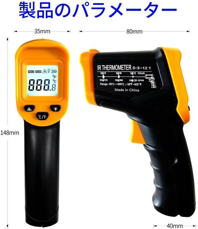 - When take measurement, pay attention to the Distance to Spot Size. As the Distance (D) from the target surface increases, the spot size (S) of the area measured by the unit becomes larger.The Distance to Spot size of the unit is 12:1 ***This unit is equipped with a laser, which is used for aiming.