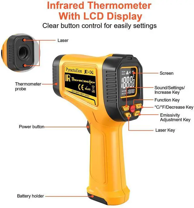 - [Energy Saving]This infrared thermometer features a color backlit screen, allowing you to easily read the measurement results at any time. The measurement results remain on the display for 15 seconds without any operation, and then it automatically shuts down, saving power and extending battery life. The ir thermometer gun also has a low battery indicator function to remind you to replace the battery in time. In addition, this temperature gun comes with 1 × 9V battery to power the temp gun.