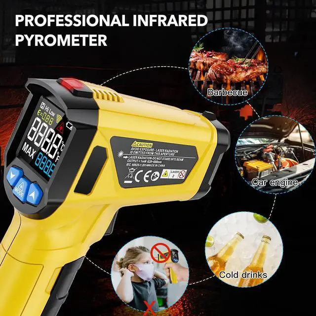 MAX data display and high/low alarm, the infrared thermometer temperature gun will alert when temp is above or below set temperature.