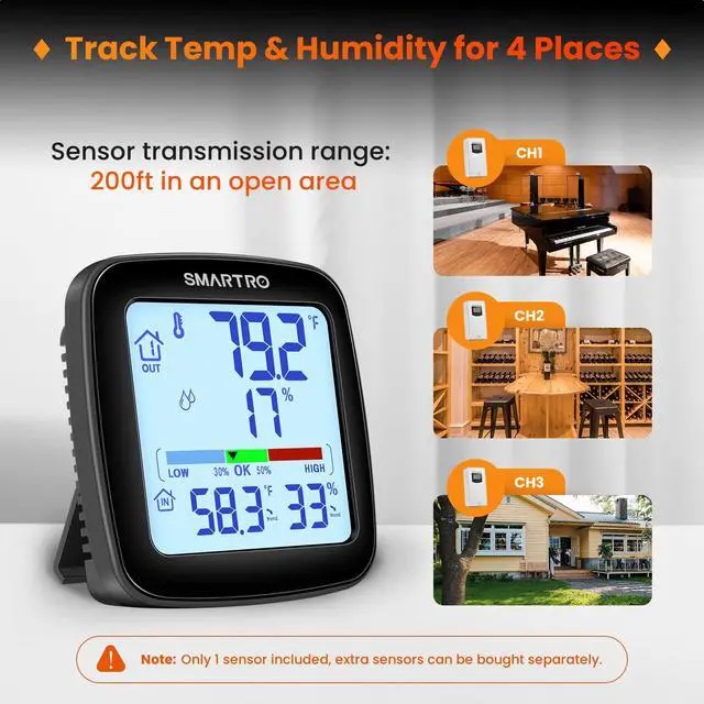 · Attention: The SC92 comes with ONLY one sensor, but you can add up to 2 more to track temperature and humidity all around your home, all from one monitor.