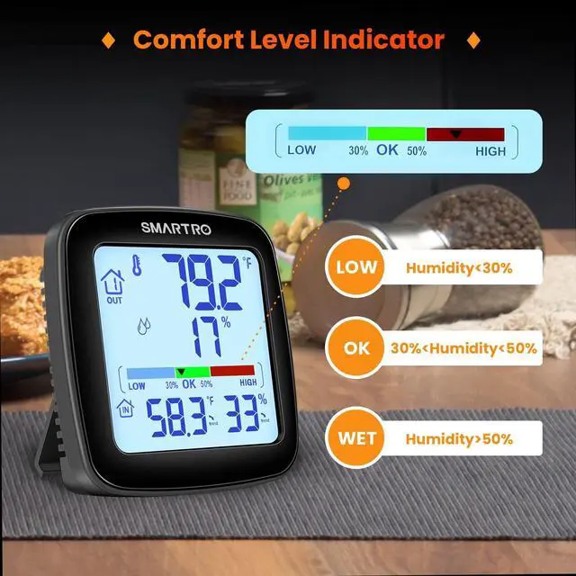 - The humidity meter comfort Indicator quickly shows whether your temperature and humidity levels are in line with those ideal for the human body, at a glance. It ensures your perfect night’s sleep, avoids headaches and improves general well being day in and day out.