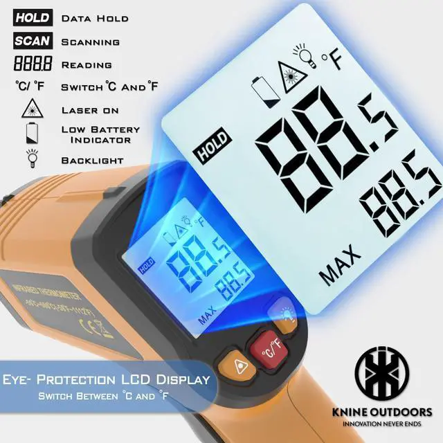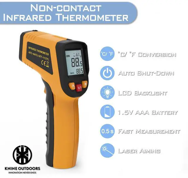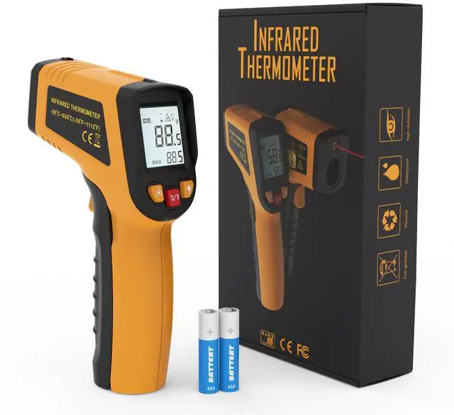The infrared thermometer offers quick and accurate temperature readings across a wide range from -58? to 1112?, making it ideal for various applications such as cooking, pools, ovens, and candy making. With a 12:1 distance-to-spot ratio, it allows for precise measurement from a safe distance.