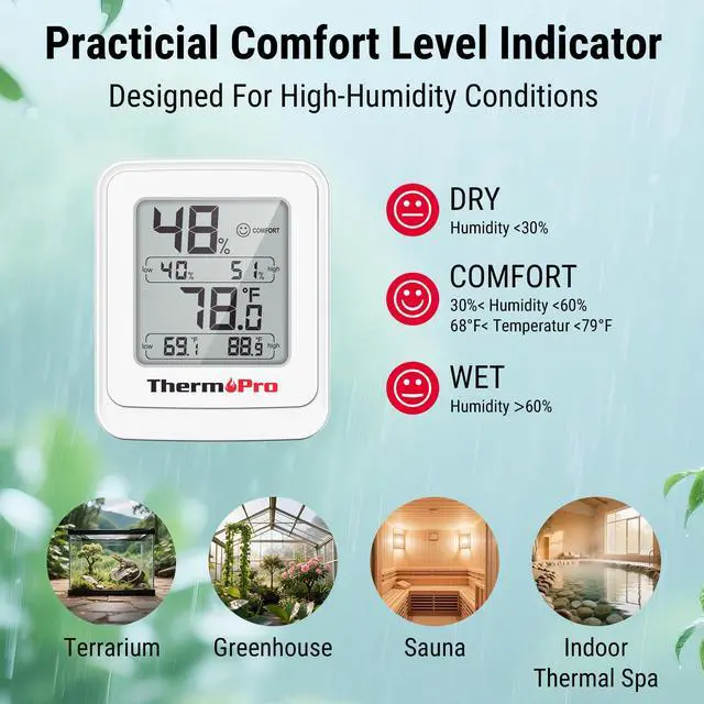Instant Comfort CheckDisplays easy-to-understand face icons based on temperature and humidity: "Dry" when humidity <30%, "Comfort" when 6879& 30%60% humidity, and "Wet" when humidity >60%; Helps you create the ideal environment for plants and pets