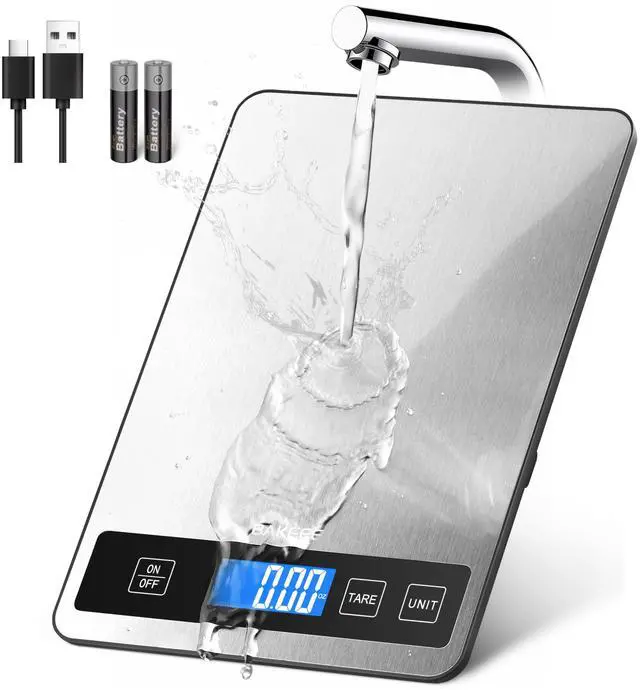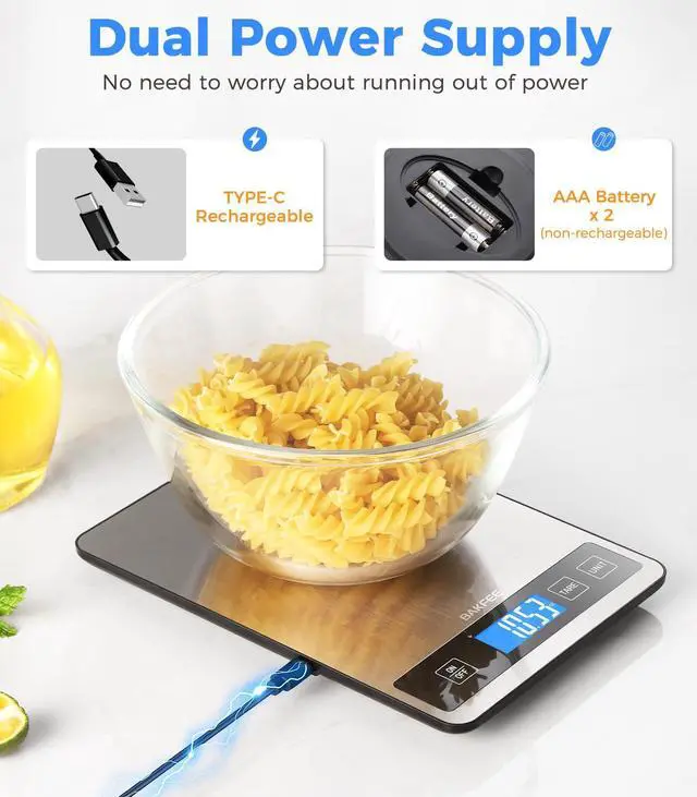 Food Scale - 15kg/33lb Rechargeable Digital Kitchen Scale with Full-View LCD Display, Grams and Ounces, Type-C or Batteries, Easy Clean Stainless Steel, for Baking, Cooking & Meal Prep, Black
