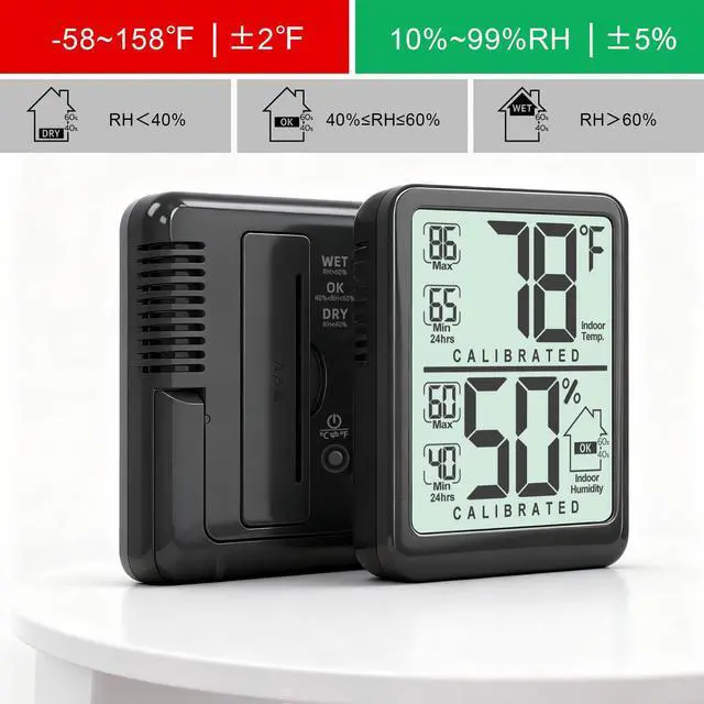 Dry, Comfort, or Wet? Our hygrometer's visual icons give you an instant humidity status check. Know precisely when to humidify or dehumidify for ideal comfort.
