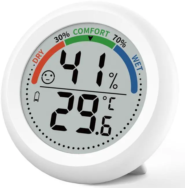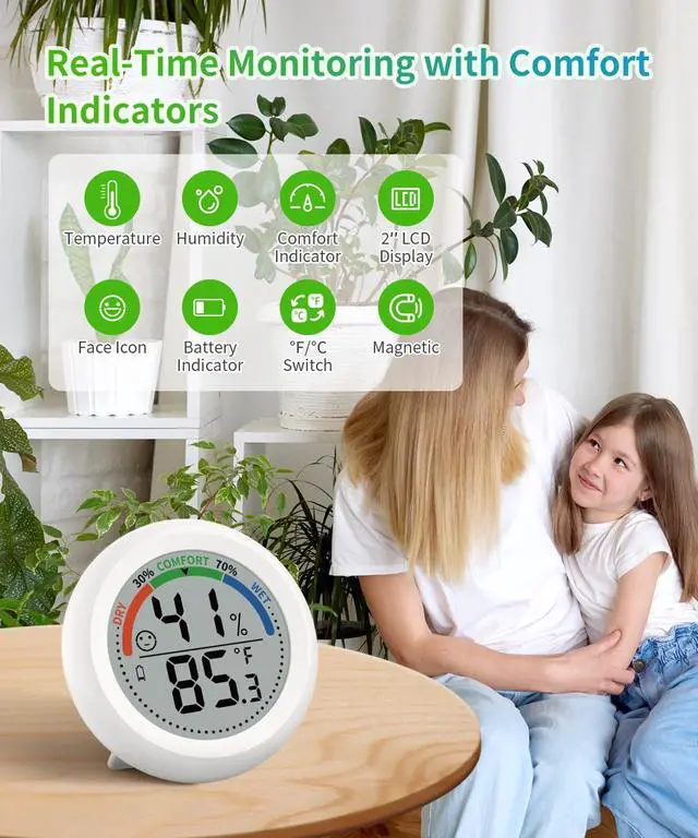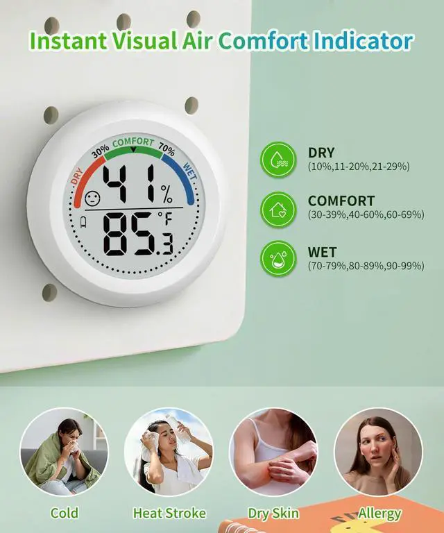 Comfort indicator (WET/COMFORT/DRY) helps maintain ideal air quality for babies, plants, or delicate storage (e.g., cigars in humidors).