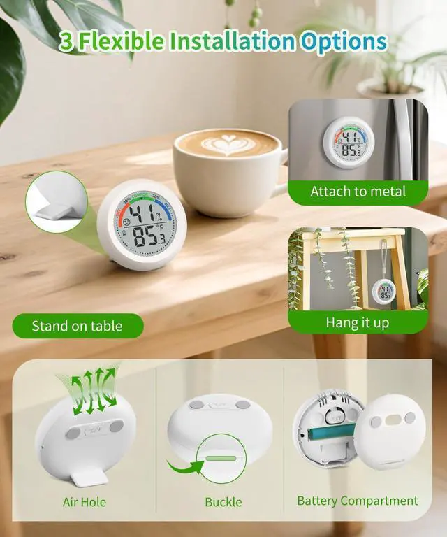 Keep your home, nursery, or greenhouse perfectly balanced with our digital room thermometer and hygrometer. Designed for precision, it monitors temperature (-9.9°C to +60°C) and humidity (10%-99% RH) with ±1°C and ±3% RH accuracy, updating every 10 seconds for real-time insights.