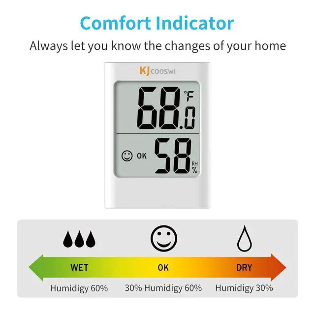 The indoor thermometer reads data every 10 seconds; It shows the trend of Humidity: DRY /COMFORT /WET.