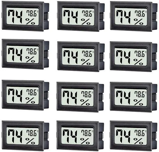 This 12 Pack Mini Digital Thermometer Hygrometer set provides reliable indoor temperature and humidity monitoring for a wide range of environments. Each compact unit is designed to deliver accurate readings with a temperature range of -58 to 158 and a humidity range of 10%99% RH, updating measurements every 10 seconds. With a temperature accuracy of ±2 and humidity accuracy of ±5% RH, these devices ensure precise environmental tracking. Their mini size makes them ideal for use in humidors, greenhouses, reptile tanks, jars, closets, incubators, grow tents, gardens, cellars, fridges, and more. The package includes 12 units with batteries pre-installed, offering convenient, immediate use for multiple locations. These monitors are essential for maintaining optimal conditions for plants, pets, and valuable items.