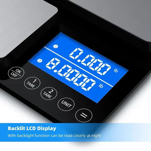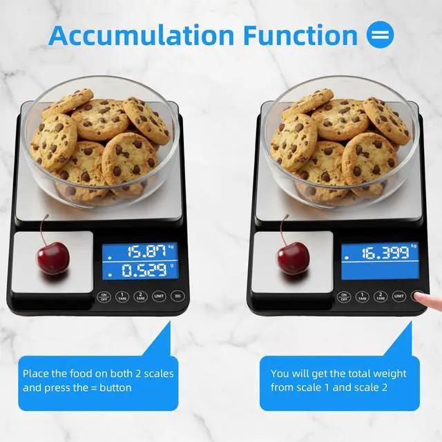 Accumulation, LCD DisplayThe new food scale features an accumulation function that combines weights from both platforms, eliminating the need for repeated measurements or manual calculations. The bright backlit LCD screen ensures clear, accurate readings even in low-light conditions