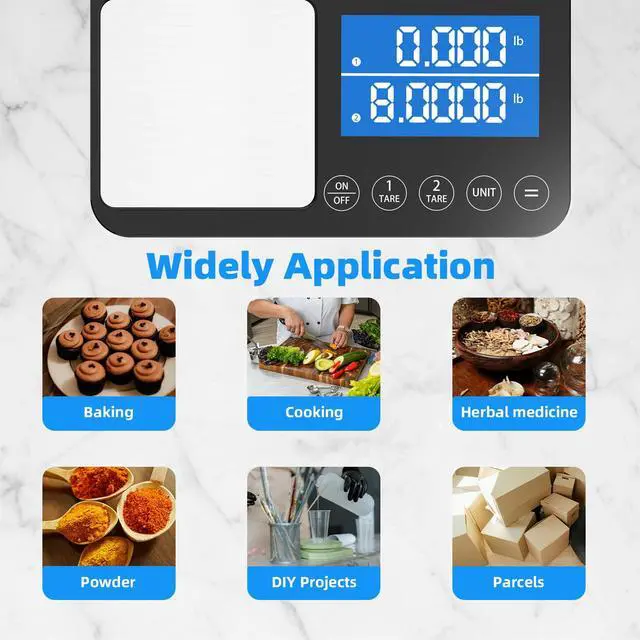 High-Precision Dual-Platform DesignThe Diyife dual-platform kitchen scale features two distinct weighing capacities, designed to provide precise weight for a variety of cooking and baking needs. The large scale has a capacity of up to 33lbs (15kg) with an accuracy of 0.03oz (1g); the small scale can weigh 500g with an accuracy of 0.001 oz (0.01g)