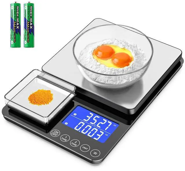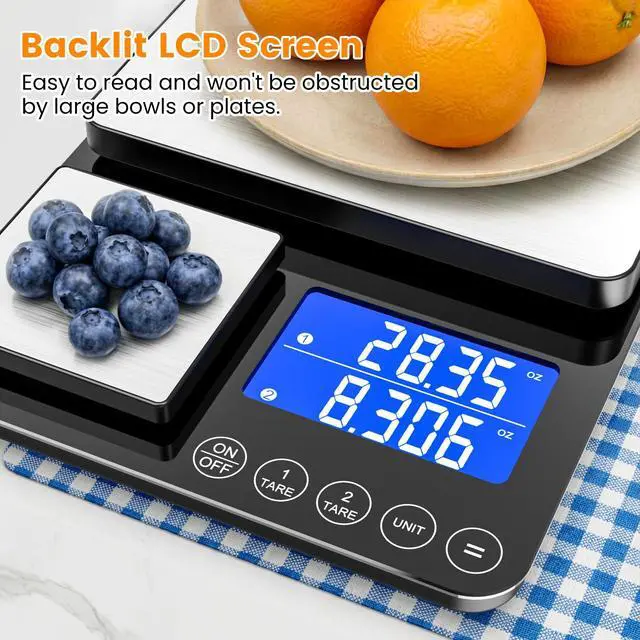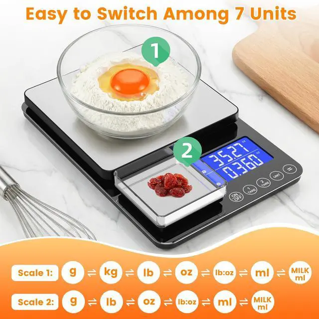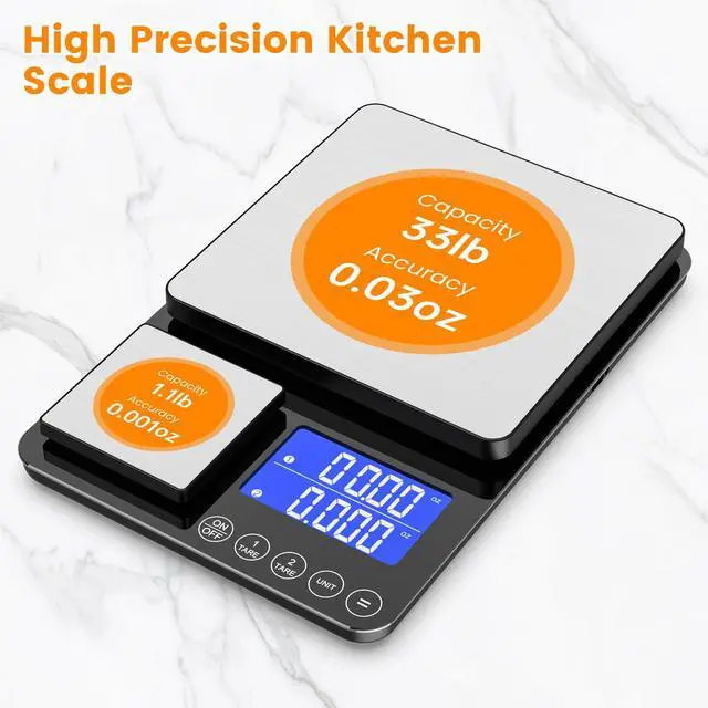 PRECISE 2-IN-1 SCALE: KKZ digital food scale features two independent platforms: a large scale with a 33lb capacity/0.03oz accuracy for bulk items, and a small scale that handles up to 1.1lb/0.001oz precision for fine ingredients. Perfect for cooking, baking, meal prep, coffee making, balanced diet
