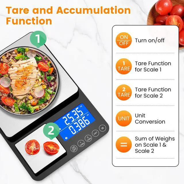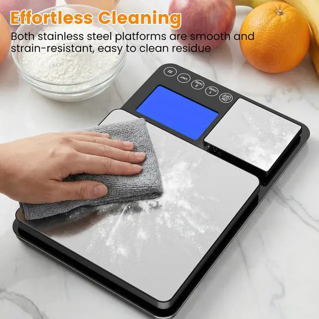 SMART WEIGHING, SIMPLE TO USE: Enhance your baking efficiency with the smart tare and accumulation functions of this baking scale. The tare feature allows you to deduct the container weight by simply pressing a button. The accumulation function lets you sum weights across both platforms, eliminating repetitive measurements and manual math