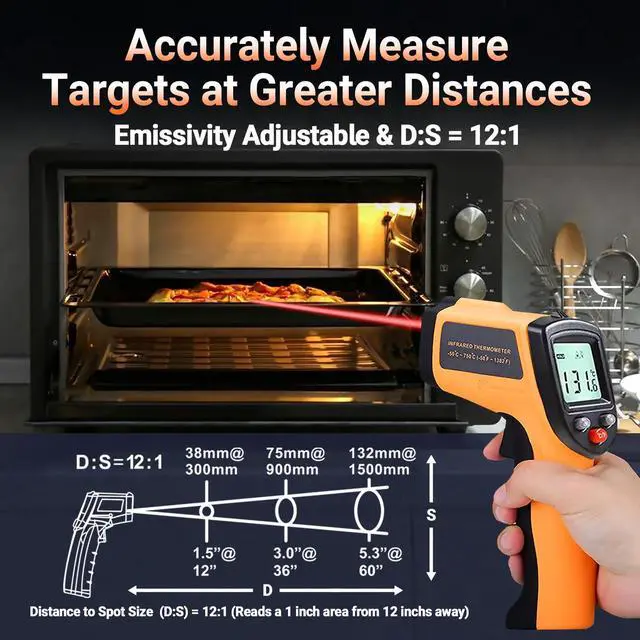 : Designed with the latest thermopile sensor technology, this infrared laser thermometer gun is accurate to ±1.5%; Improve this pizza oven thermometer gun measurements by adjusting the emissivity from 0.11.0 to match the surface material being measured