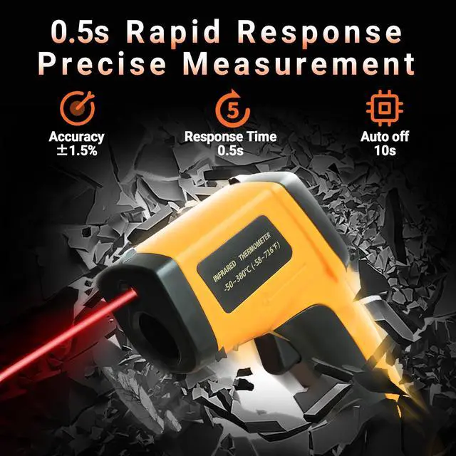 - : With its distance-to-spot ratio of 12:1 and a response time <500Ms, this infrared temp gun thermometer can quickly provide temperature readings of any target, even at great distances