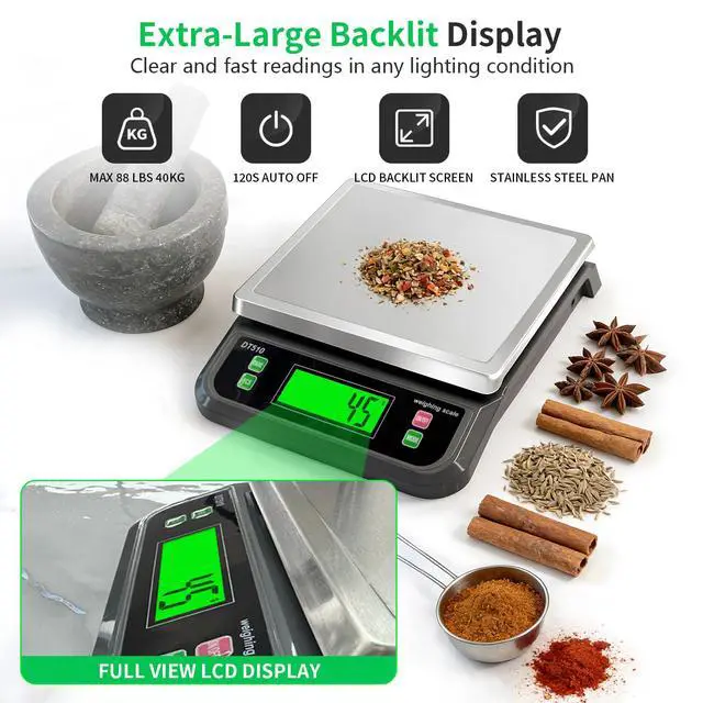 Large Commercial Kitchen Scale: High-clearly Full View LCD Display allows you to read from any angle, ensuring clear readings even in dark environments.
