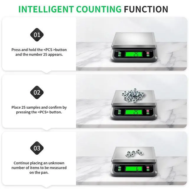 commercial scale for food: Easy Tare with a simple press of the tare button, you can subtract the weight of plates or containers, ensuring precise ingredient measurements,The PCS function enables small identical items counting such as pins, beads, screws.