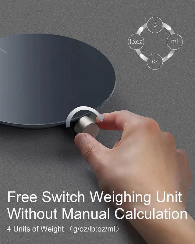 ALL-IN-ONE BUTTON DESIGNThe kitchen scale develops a new interactive design to combine different functions into one button that is user-friendly. Users can switch between 4 units of weight: g/ml/oz/lb: oz without manual calculations to satisfy different needs of weighing