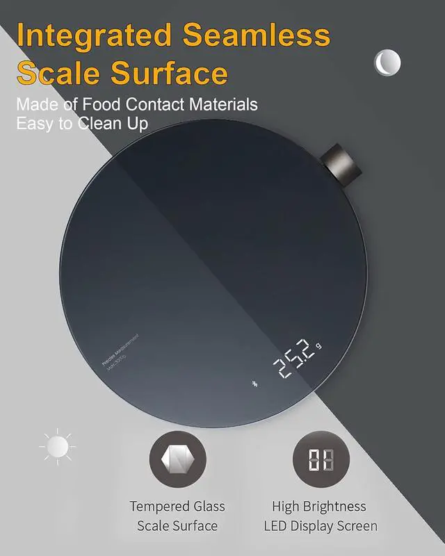 INTEGRATED DESIGNThe weighing data are shown clearly by the high-resolution LED screen, which is under the clear display tempered glass of scale surface. And the integrated seamless surface of the gram scale is made of food contact materials that are easy to clean