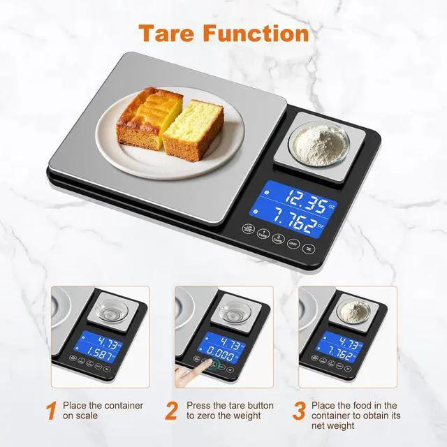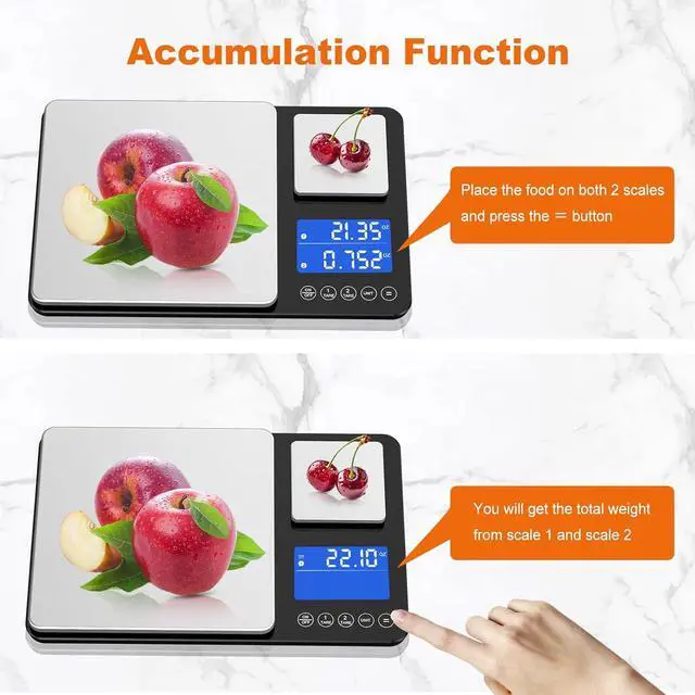 Tare | Accumulation: The digital food scale has tare and accumulation functions. Simply place the container on the scale press the tare button and then add the ingredients into the container to get the weight of the ingredients without including the container. The accumulation function enables you to sum the weights of items on two scales eliminating the need for repeated measurements or manual calculations. These features work together to make food preparation more efficient and precise. LCD Display |