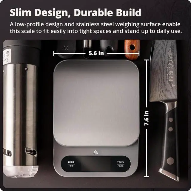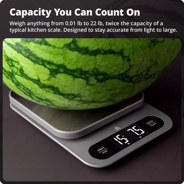 ?????????????????????????????????????? &????????: This high-capacity kitchen scale weighs up to 22 lb (10 kg) with 1 g precision ready for meal prep holiday baking sourdough or grilling. Not for laboratory or microgram measurements.??????????????????????????????????: Weigh ingredients in grams ounces lb: oz or milliliters with precise 1 g increments. The ZERO function resets the scale instantly for use with meal prep containers mixing bowls and Dutch ovens.????????????????????????????????????????????: The bright Hi-Def LCD display extends beyond the weighing platform for better visibility under large mixing bowls. Use HOLD to keep readings on screen for up to 5 minutes or let auto shut-off after 2 minutes save battery life.?????????????? &??????????????????????: Stainless steel and touch-sensitive controls resist stains and buildup to stay hygienic with minimal upkeep. Designed for everyday use it delivers lasting quality and effortless care for your kitchen routine.?????????????????????? &?????????? -????????????: Runs on 3 AAA batteries (included) and measures 7.6 x 5.6 x 1.3 in. for a streamlined fit. Backed by a 5-year limited warranty and lifetime support from our St. Louis team trusted by health-conscious families home bakers and meal preppers.