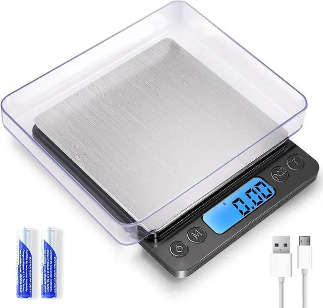 LITHIUM BATTERIES: The kitchen scale's newly upgraded lithium-ion battery has a larger capacity faster charging and longer life and updated with 3 power supply modes USB charging AAA battery power and plug-in power the gram scale allows you to travel or enjoy outdoor weighing without worrying about running out of power. It is also more environmentally friendly and cost effective with its self-developed power saving motherboard which is more energy efficient than other productsMULTI-FUNCTION: kitchen scale offers a choice of nine units: g ct dwt ozt oz gn lb tl ml. The units can be changed immediately by pressing M. The TARE function of the Ounce Scale can zero the weight of objects on the platform. No manual calculations are required making it more efficient and accurate. The PCS function can calculate the same for small items such as beads screws etc. It also offers automatic shut-offs low battery alerts and overload functions.