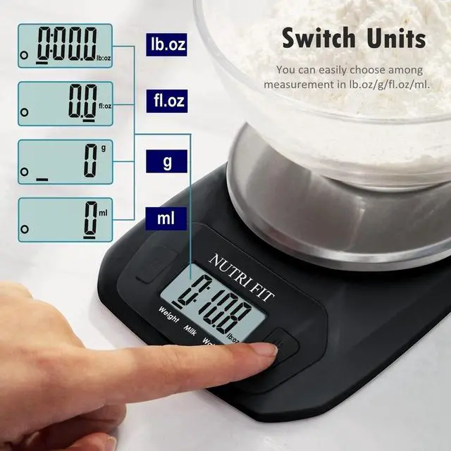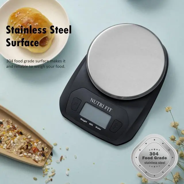Food Grade Stainless Steel Surface: Anti-fingerprint and easy-clean coating make cleaning easy. The accurate measure of the scale is better for dieting and losing weight no matter what you are on excersise or traveling. A large backlight LCD screen that displays weights in lb: oz g ml and fl. oz Auto tare & zero Function low power overload indication. Perfect for home cooking baking camping and food portioning. Multifunction food scale equipped with high precision sensors and liquid measurement technolgy provide you accurate measurements from 0.1 oz /1 g up to 5000g/11 lbs. Increment for 1g/ 0.1 oz. Come and use with only 2 AAA original batteries. The scale will be auto-off after 2 minutes it will help to save the power while you are not going to use it.