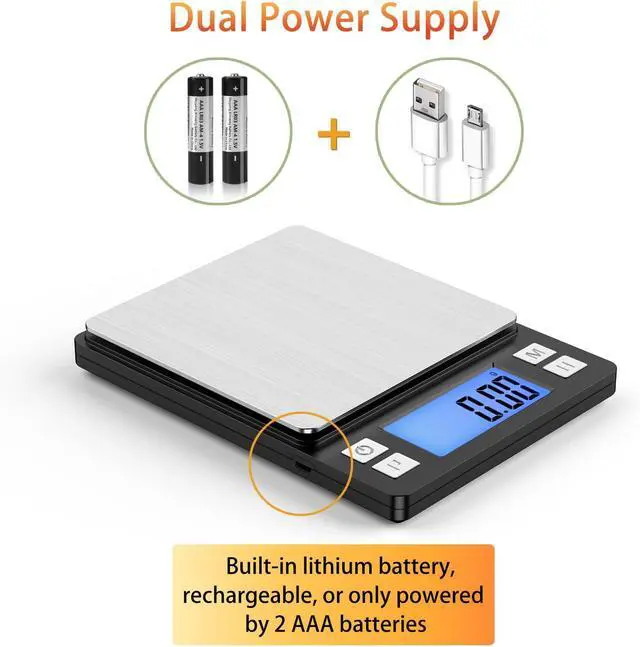 Size: 5.5 *4 * 0.7 inches taking up minimal kitchen space and conveniently portable. The scale platform made of stainless steel is durable and easy to clean. Come with two trays. Added waterproof stickers can enhance waterproof ability. [ Dual Power Supply & USB Rechargeable ] With built-in lithium battery can be charged by USB cable. Can also be powered by two AAA batteries.
