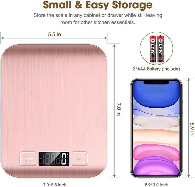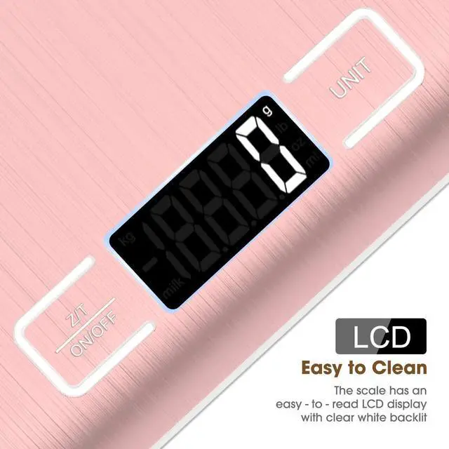 Precise Weight22lb capacity 1g resolution the digital food scale with built-in four high-precision load sensors provide more accurate measurements and instant readings. Multifunction ScaleThis digital kitchen scale has 6 measurement unit to meet all the food weight that you need: g kg lb oz ml milk ml. Big bright LCD display easy to read. Easy TareConvenient tare button for tare calculation allows you to subtract the weight of plate or container making it easy to achieve accurate readouts of ingredients. This digital weight scale is for better cooking baking tracking intake weight loss and postage. Compact SleekStainless-steel digital scale is designed with food-grade 304 stainless-steel platform for easy cleaning and maintenance the digital kitchen scales convenient size makes it easy to store in your kitchen. Great Support2 AAA batteries included. Our products are rigorously tested and made with love. For any issues please reach to us we stand behind our kitchen scales.