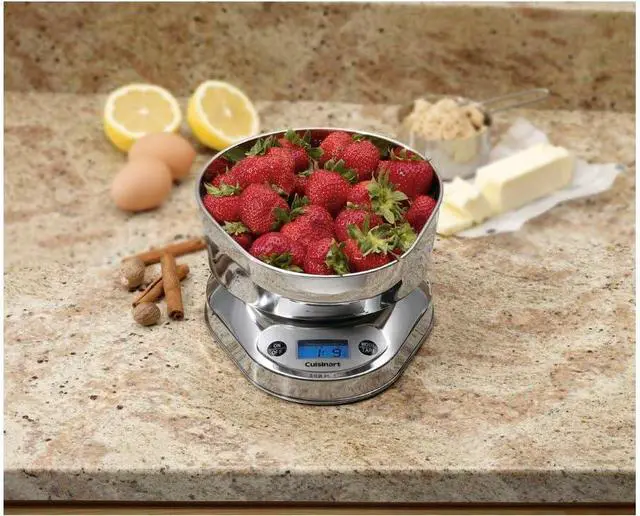 Tempered glass platform with removable stainless steel cover; weigh directly on the platform or use additional bowl sanitary safe food handlingStainless steel bowl features gradient marks for easy measuring and inverts as a protective cover for sleek countertop displayLarge LCD readout offer accurate readings in imperial or metric mode are easy to read at a glance with batteries includedAdd on Weight feature allows you to weigh multiple ingredients without starting from scratchProduct Built to North American Electrical Standards