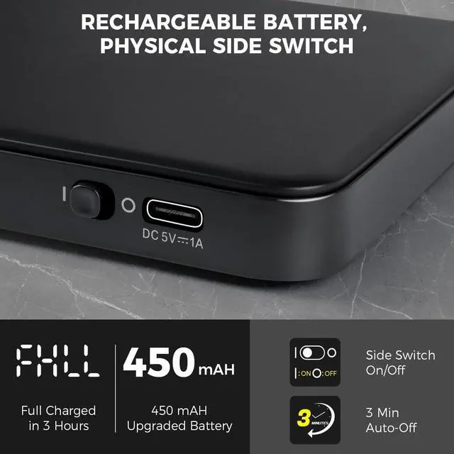 & Energy Efficient: Powered by a larger 450mAh battery this TYPE-C rechargeable coffee scale lasts longer and charges faster. Auto shut-off after 3 minutes conserves power while dual activation (side switch + touchscreen) enhances safety and controlLED