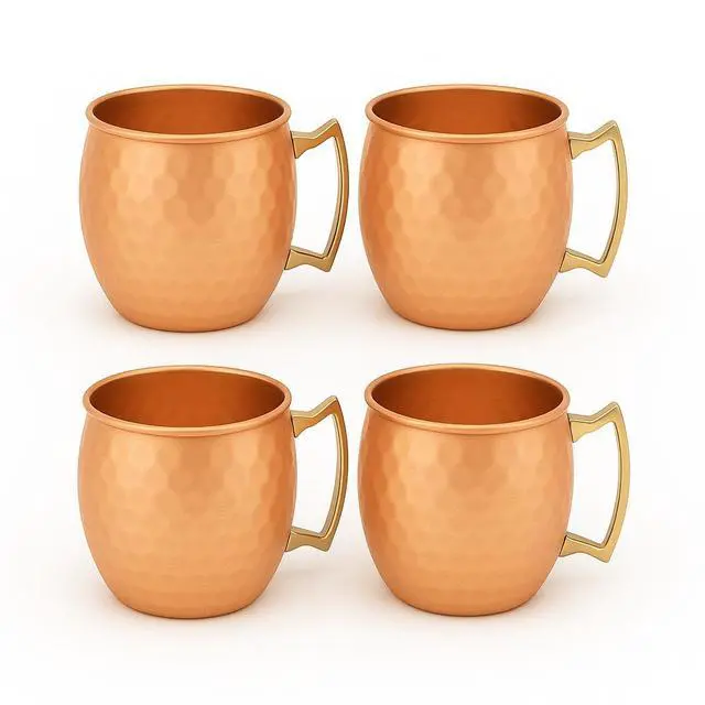 Modern Home Handmade 16oz Solid Copper Mule Mug Barrel Shaped Mug with Brass Handle & Hammered Texture (Set of 4)